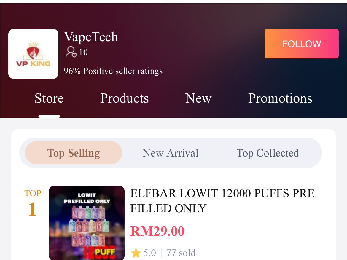 Kesalahan : Larangan penjualan produk merokok/vape di IPT, pasar, vending machine, dan online