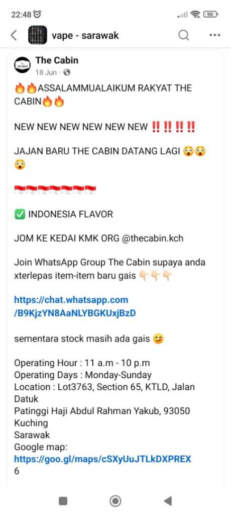 Nama Kedai : The Cabin (Facebook) – https://www.facebook.com/thecabin.kch/